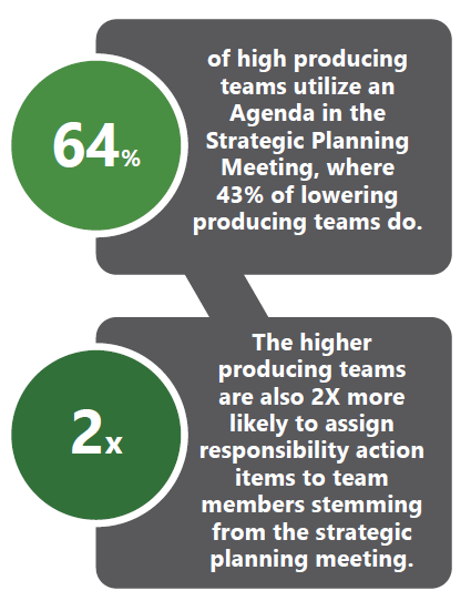 The utilization of structured agendas in strategic planning meetings and the assignment of responsibilities for action items are two practices that starkly differentiate high performing teams from lower-performing teams. This structured approach ensures that discussions are focused, time-efficient, and aligned with the team's strategic goals, facilitating a more productive planning process.